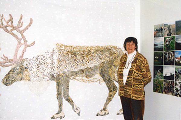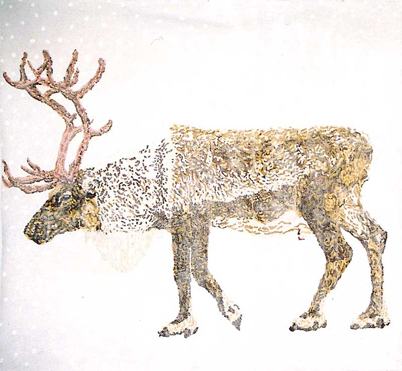 Huntenkunst 2010 Huntenkunst 2010 Het Rendier lost op in SNEEUW door de WIT ‘HEID’ van zijn wintervacht en IJslands landschap als foto-collage Rendier – 225 x 240 cm – acryl op papier – 2009/ 2010