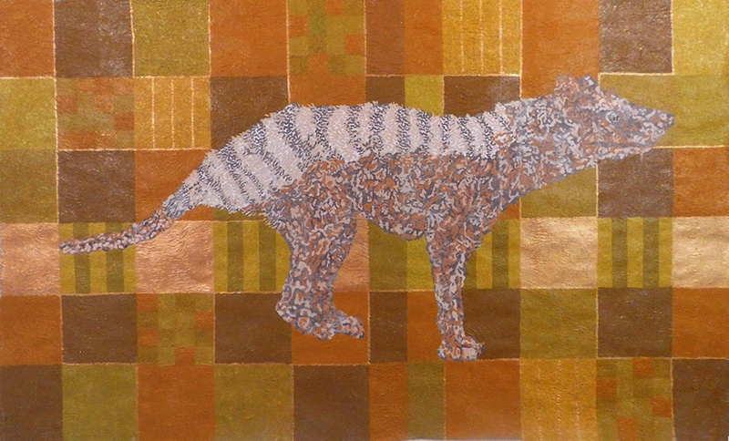 Huntenkunst 2019 De TASMAANSE BUIDELWOLFook wel de Tijgerwolf of de Thylacine(uitgestorven in 1936)isin 2019opnieuw GEBORENen voor altijd VEREEUWIGD Huntenkunst 2019 Tasmaanse Buidelwolf | maat: 170 x 105 cm | materiaal: acryl op papier